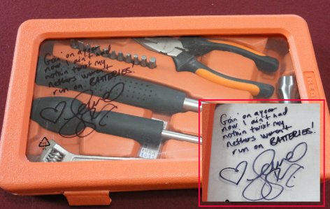 There is also a live auction with some great items. Who wouldn’t want a set of tools signed by Jewel Staite? Just take a look at how she signed it!